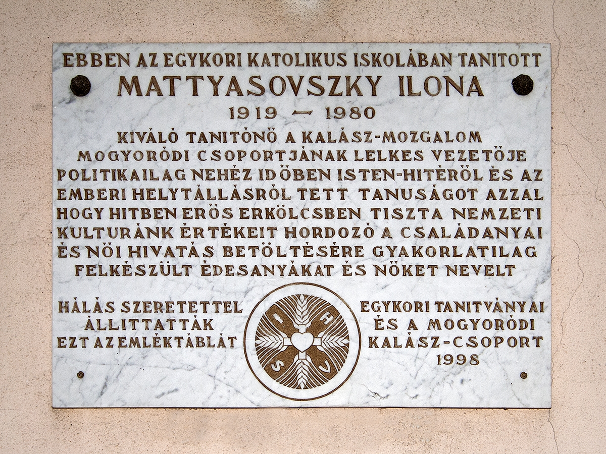 Mogyoródon a Dózsa György utcában, az egykori katolikus iskola falán találjuk az iskola korábbi tanítójának Mattyasovszky Ilonának az emléktábláját. A tanítónő az Kalász-mozgalom tagjaként a nemzeti és vallási nevelést képviselte a diktatúra nehéz éveiben is. Az emléktábla szövege: "Ebben az egykori katolikus iskolában tanított Mattyasovszky Ilona 1919-1980 kiváló tanítónő, az egykori Kalász-mozgalom mogyoródi csoportjának egykori lelkes vezetője. Politikailag nehéz időben Isten-hitéről és az emberi helytállásról tett tanúbizonyságot azzal, hogy hitében erős, erkölcsben tiszta nemzeti kultúránk értékeit hordozó, a családanyai és női hivatás betöltésére gyakorlatilag felkészült édesanyákat és nőket nevelt.Hálás szeretettel állíttatták ezt az emléktáblát egykori tanítványai és a mogyoródi Kalász-csoport 1998."