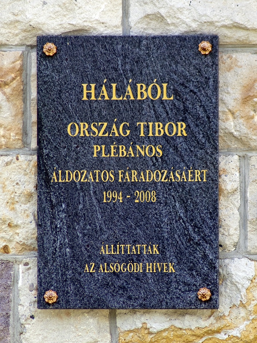 Az alsógödi Szent István Király templom udvarán találjuk a templom újjáépítésében vezető szerepet játszó Ország Tibor emléktábláját. A templomot 1993. április 30-án éjszaka egy helyi fiatal felgyújtotta. A romok eltakarítása és az új templom építésének a megszervezése szinte azonnal megkezdődik. 1995 áprilistól Ország Tibor nógrádi plébános kapott megbízást a templom építésére. A tényleges építkezés 1995 május 30-án kezdődött meg. Ország Tibor 1995 július elsejével felsőgödi plébánosi megbízást kapott, amely kiterjedt Alsógöd ellátására is. A templom felszentelésére 1996 augusztus 20-án került sor. Az új plébániát 2002. augusztus 20-án szentelték fel. Az újjáépítésben tett fáradozásaiért Ország Tibor emléktáblát kapott az alsógödi hívektől. Az emléktábla szövege: "Hálából Ország Tibor plébános áldozatos fáradozásaiért 1994-2008. Állíttatták az alsógödi hívek."