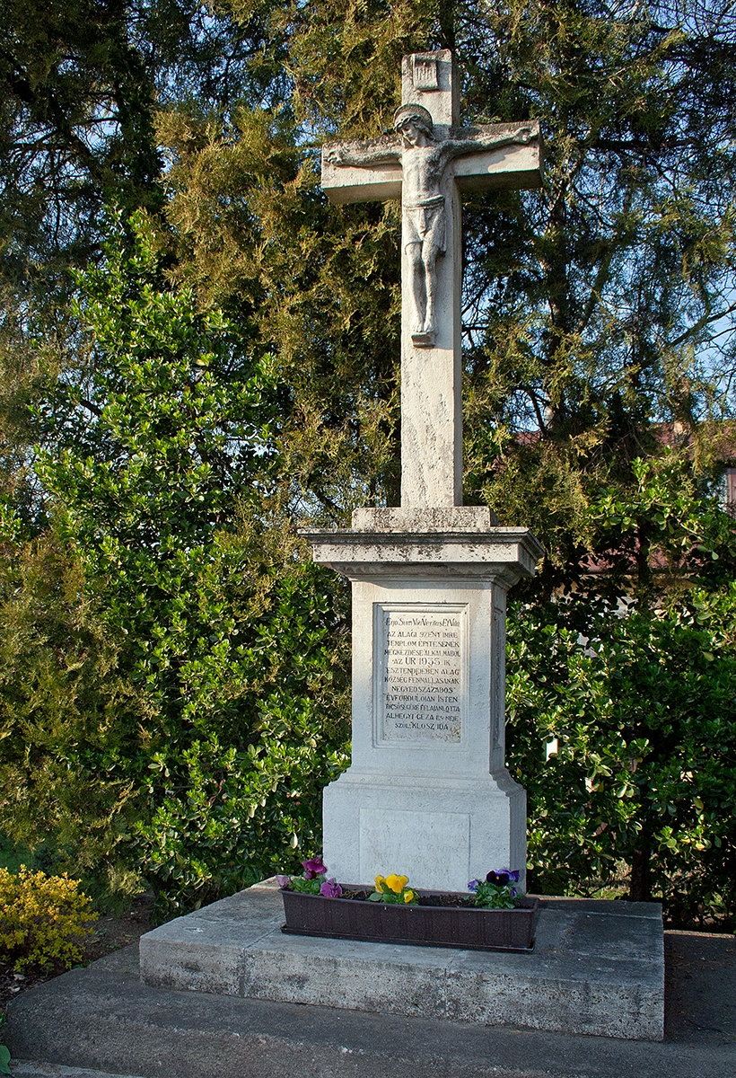 A kereszt talapzatán emléktábla olvasható, amelynek szövege: "Ego Sum Via Veritas et Vita. Az alagi Szent Imre templom építésének megkezdése alkalmából az Úr 1935. esztendejében Alag község fennállásának negyedszázados évfordulóján Isten dicsőségére felajánlotta Alhegyi Géza és neje szül. Klosz Ida."