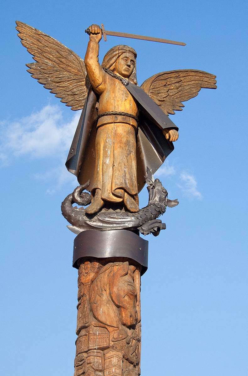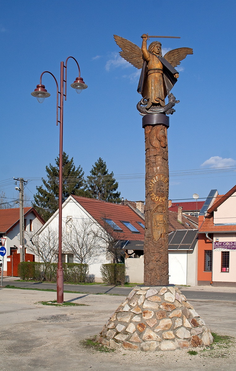 Dunakeszi első írásos említésének 750. évfordulójának az évében, 2005-ben emlékoszlopot emelt a város a jubileum tiszteletére. Az egy méteres betonból készült, díszkövekkel kirakott talapzaton álló emlékoszlopot Dér Győző helyi fafaragóművész készítette és adományozta a városnak. Az oszlop egy szál fából lett kifaragva, tetején a város védőszentje, Szent Mihály áll kezében karddal, és éppen a lábainál fekvő sárkányra készül lesújtani. Az arkangyal palástja és a sárkány rézből készült. Az alkotót az emlékoszlop megfaragásakor a Traianus oszlop ihlette, így az oszlopon végigkövethetjük a magyar történelem, valamint a város történelmének nagy pillanatait. Az események alulról felfelé haladva kronologikus sorrendben követik egymást a honfoglalástól kezdve napjainkig. A történelmi áttekintésben kiemelt szerepet kapott IV. Béla magyar király, akinek okleveléhez köthető a 750 éves évforduló. Az emlékoszlopon Dunakeszi történelme mellett Alag történetének nagy pillanatait és szimbólumait is megtalálhatjuk. Az emlékművön két feliratot olvashatunk. Az oszlopon: Dunakeszi 750 éves. A kiírás mellett ott szerepel a két évszám is: 1255 és 2005. A talapzaton pedig a Himnusz egy sora olvasható: „hozz rá víg esztendőt”.