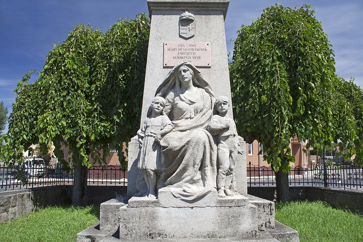 A település első köztéri alkotása a Szent István úton álló I. világháborús emlékmű, közkeletű nevén Hősi emlékmű. Dunakesziről az első világháborúban 549-en vonultak be, közülük sajnos 116-an hősi halált haltak. Az ő emlékükre emelte 1928-ban a község lakossága az emlékművet, egyharmad részt közadakozásból, kétharmad részt pedig a földek haszonbéréből. A hősi halottak névsorát az emlékmű két oldalán, márványtáblákon is megörökítették.