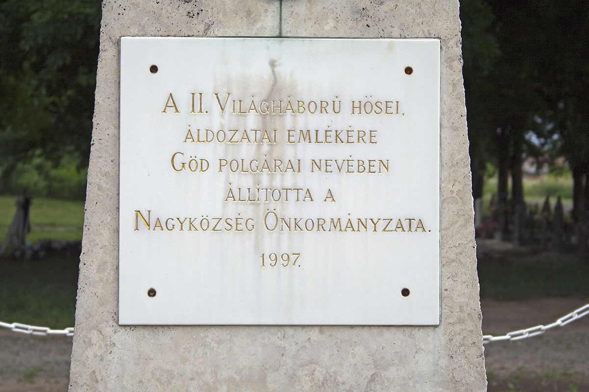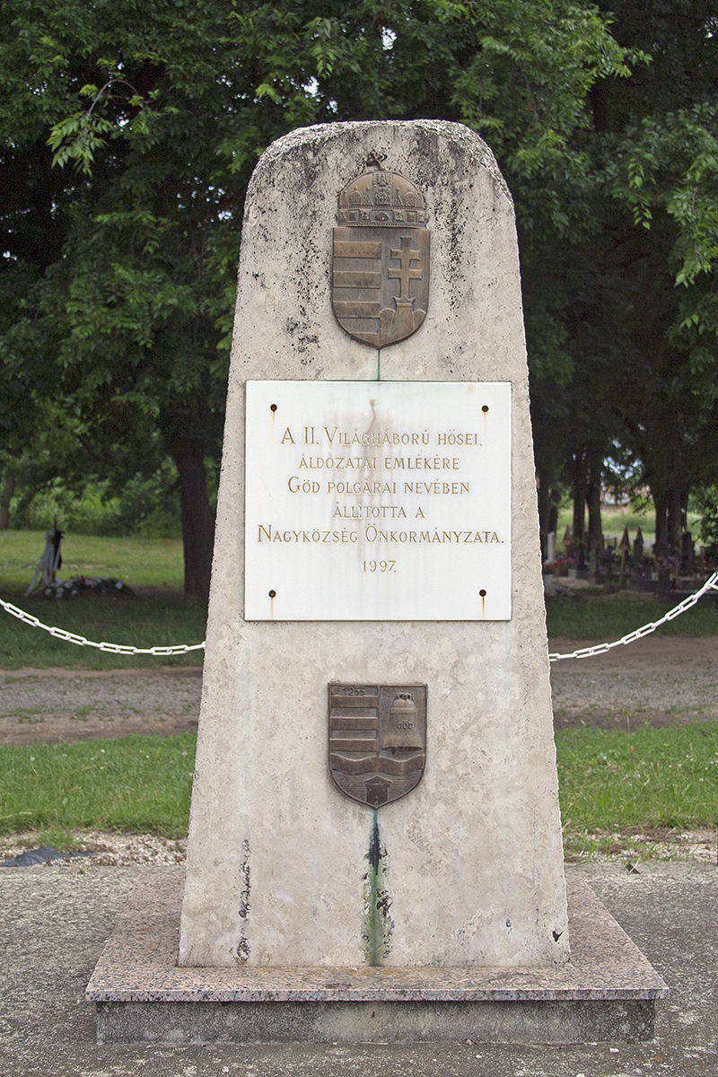 A gödi újtemetőben, a ravatalozó mögötti területen találjuk a település II. világháborús emlékművét. Az emlékmű egy lánckerítéssel elkerített helyen áll, beton alapzaton. Téglalapot formáz, amelynek felső vége lekerekített, mint egy nagy sírkő. Az egyszerű emlékművön megtaláljuk egy bronzból készült magyar címert, valamint ugyancsak egy bronz települési címert találunk. Közöttük egy emléktáblán a következő szöveg olvasható: "A II. világháború hősei, áldozatai emlékére Göd polgárai nevében állíttatta a nagyközség önkormányzata 1997."