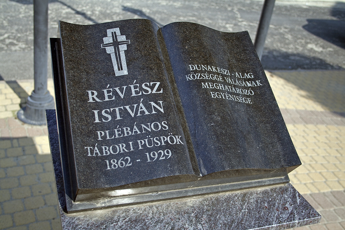 Az emlékmű kompozíciója egyszerű. Egy egy méter magas posztamensen egy nyitott könyv látható, amely nyilvánvalóan a szentírást juttatja az ember eszébe. A könyv "lapjain" a következő szöveg olvasható: "Révész István plébános tábori püspök 1862-1929. Dunakeszi-Alag községgé válásának meghatározó egyénisége."