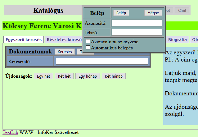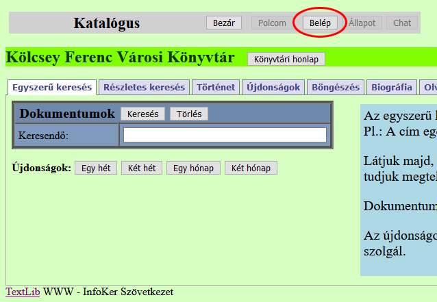 Online katalógusunkba belépve előjegyezhet, foglalhat dokumentumokat, illetve a kikölcsönzött dokumentumok lejárati idejét is meghosszabbíthatja.