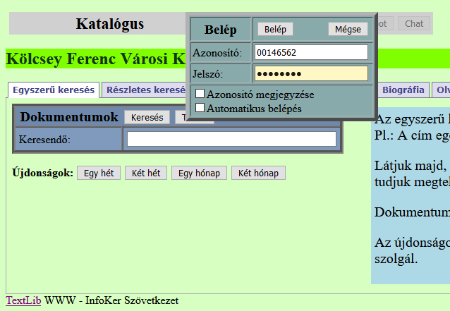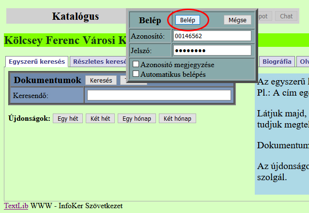 A jelszó – ha az olvasó nem változtatja meg – az olvasó születési dátuma nyolc karakterben, pl. 19561023