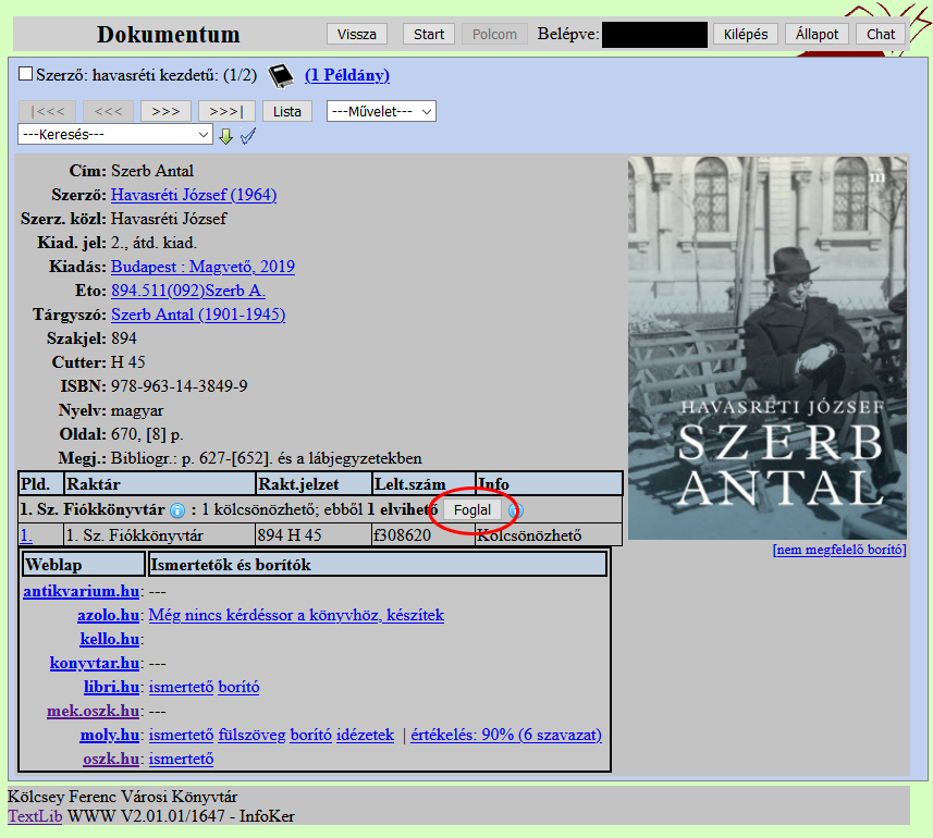 Ha a kívánt dokumentum kölcsönözhető, a Foglal gombra kell kattintani.