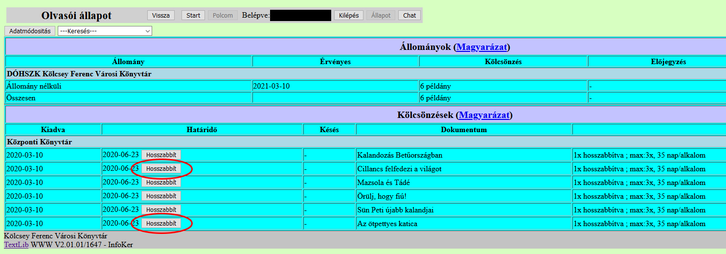 Az olvasó meg tudja hosszabbítani a nála lévő dokumentumok lejárati idejét, ha nem érkezett a kérdéses műre előjegyzés/foglalás. Hosszabbításra háromszor van lehetőség.