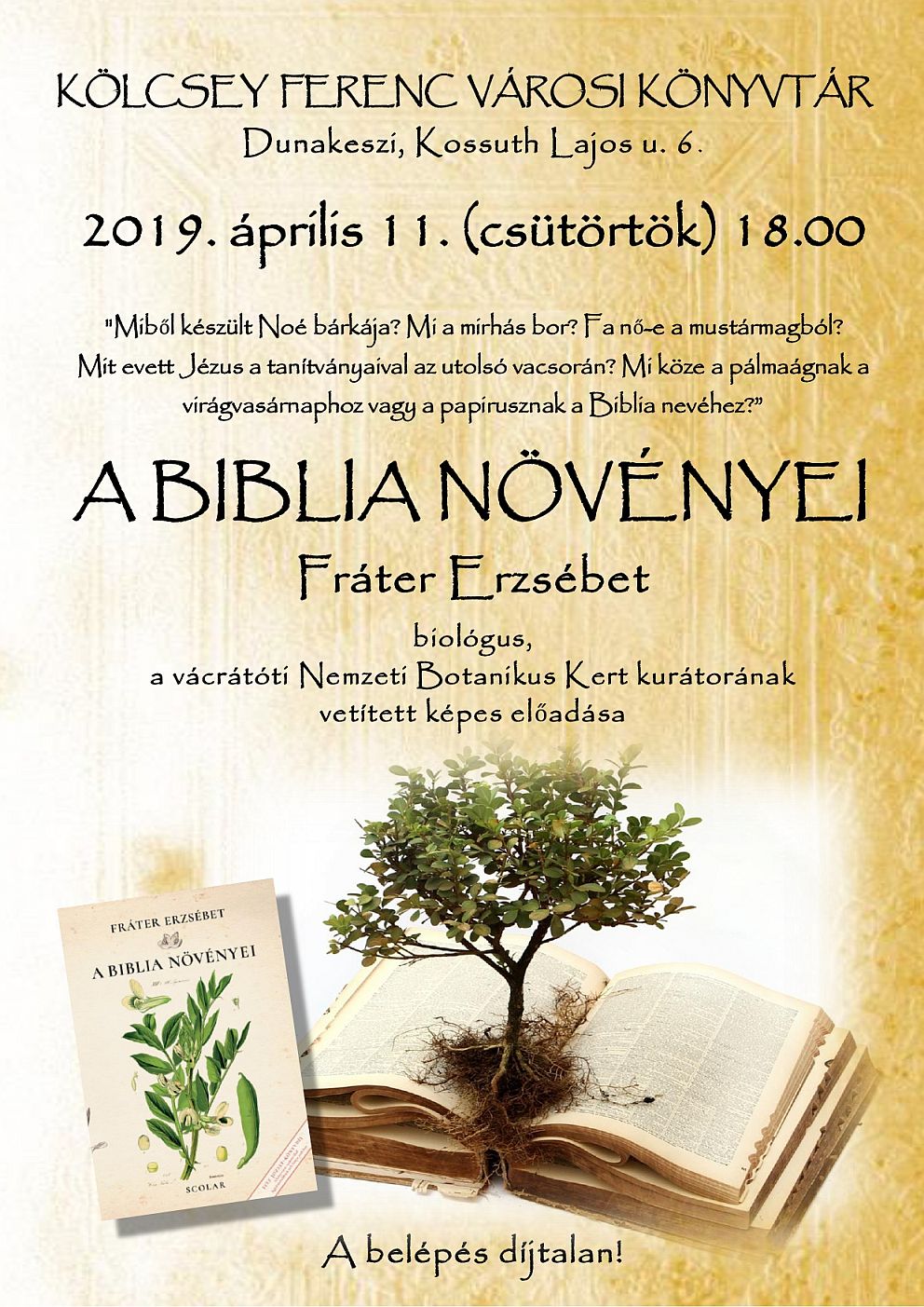 A Biblia növényei címmel Fráter Erzsébet biológus, a vácrátóti Botanikus Kert kurátora tart vetített képes előadást április 11-én, csütörtökön 18 órától a könyvtárban.