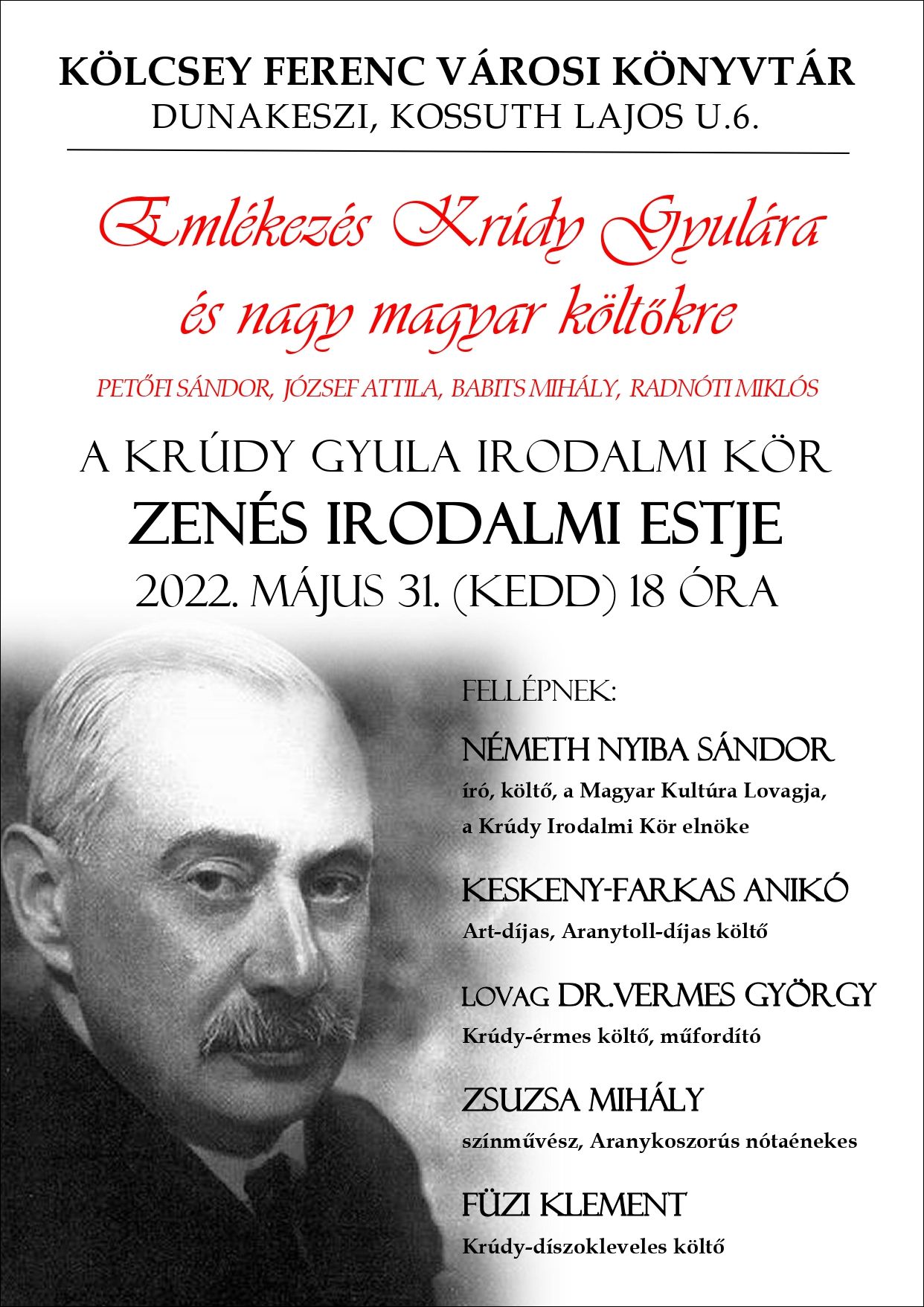 Fellépnek: Németh Nyiba Sándor író, költő, a Magyar Kultúra Lovagja, a Krúdy Irodalmi Kör elnöke; Keskeny-Farkas Anikó Art-díjas, Aranytoll-díjas költő; lovag Dr. Vermes György Krúdy-érmes költő, műfordító; Zsuzsa Mihály színművész, Aranykoszorús nótaénekes; Füzi Klement Krúdy-díszokleveles költő.