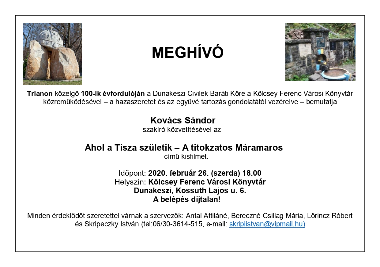 Trianon közelgő 100-ik évfordulóján a Dunakeszi Civilek Baráti Köre a Kölcsey Ferenc Városi Könyvtár közreműködésével – a hazaszeretet és az együvé tartozás gondolatától vezérelve – bemutatja Kovács Sándor szakíró közvetítésével az AHOL A TISZA SZÜLETIK – A TITOKZATOS MÁRAMAROS című kisfilmet.