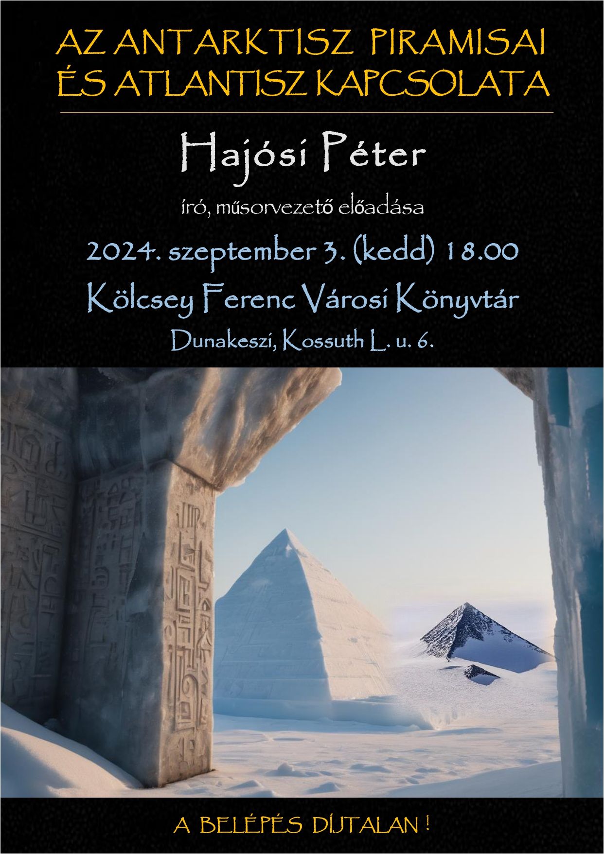 „Az Antarktiszra nem csak Hitler indított expedíciót földönkívüli ereklyék után kutatva, de a világ kormányai is hallgatnak nagyon valamiről, ami a felszín alatt rejtőzik. Az ott található piramisok csak a jéghegy csúcsai csupán? Mi lehet az egyezés az Antarktisz és a legendás Atlantisz között? Mit titkolhatnak előlünk? Hajósi Péter író és kutató évek óta kereste erre is a választ és megdöbbentő tényekre bukkant.”
