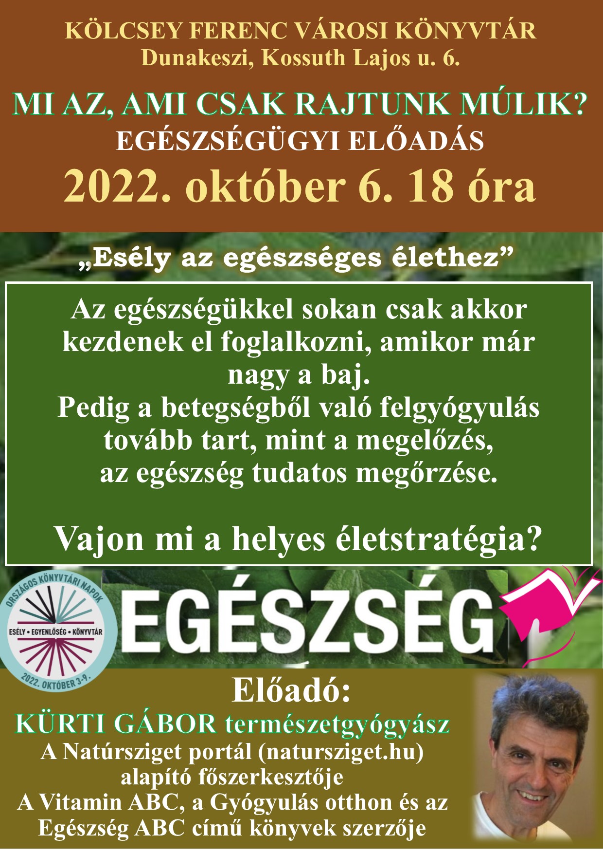 Előadó: Kürti Gábor természetgyógyász, a Natúrsziget portál (natursziget.hu) alapító főszerkesztője, a Vitamin ABC, a Gyógyulás otthon és az Egészség ABC című könyvek szerzője