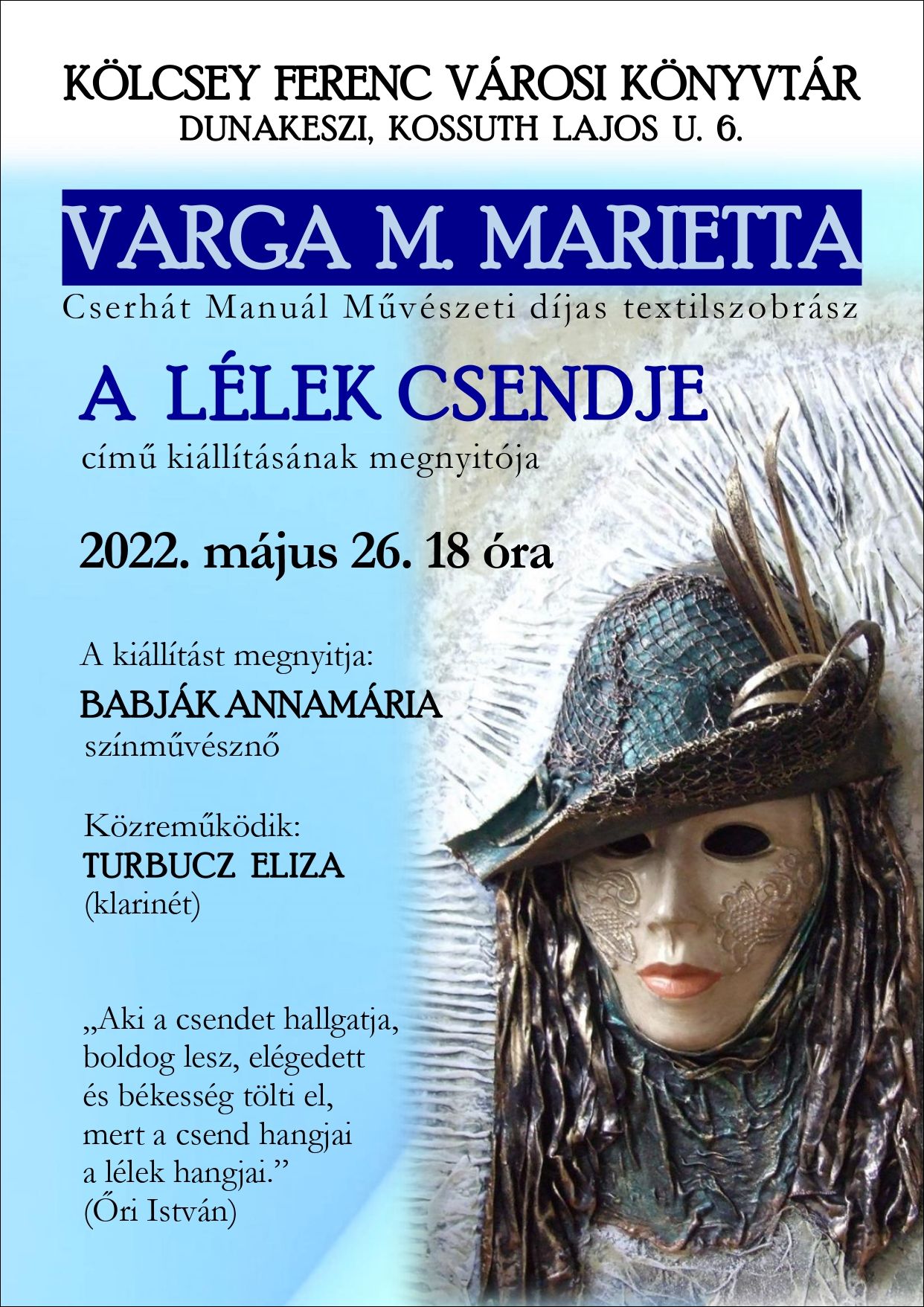 Varga M. Marietta textilszobrász „A lélek csendje” című kiállításának megnyitója a könyvtárban. A kiállítást megnyitja Babják Annamária színművész. Közreműködik Turbucz Eliza (klarinét).