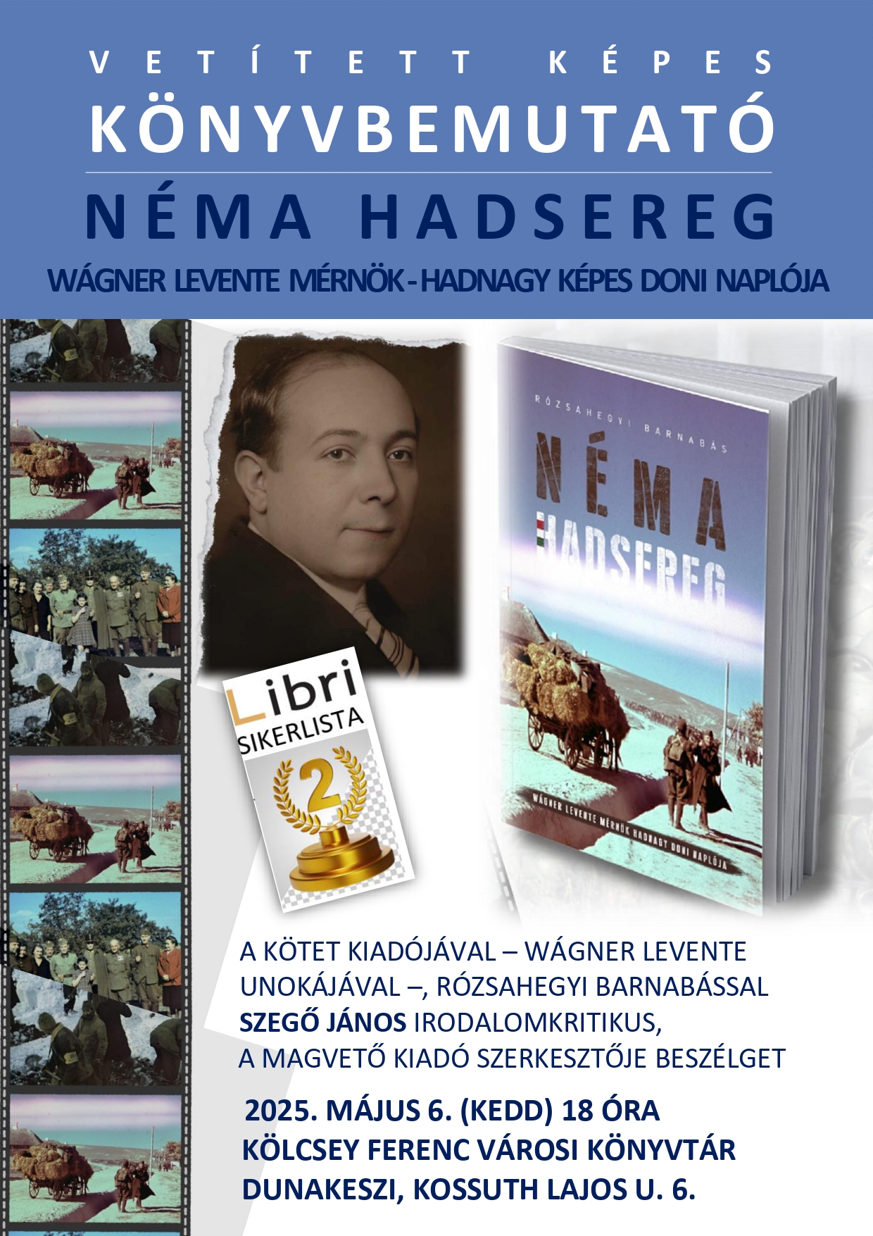 „A Néma Hadsereg Wágner Levente (1897-1977) I. világháborús veterán, tartalékos mérnök hadnagy hiteles doni naplója, aki SAS – behívóval a 205. munkavezető törzsével és kb. 400 fő zsidó munkaszolgálatossal utazik a hadszíntérre. A napló az 1942. szeptember 8-tól 1943. február 19-ig tartó időszakot tárja az olvasó elé. A 120 db – kiváló állapotban digitalizált, és retusált – eddig sehol nem publikált színes fénykép segítségével megelevenednek nemcsak a szenvedéssel teli mindennapok, hanem az élni akarás is.