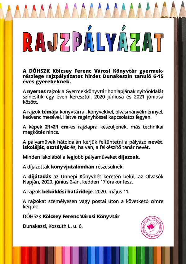 A DÓHSZK Kölcsey Ferenc Városi Könyvtár gyermekrészlege rajzpályázatot hirdet Dunakeszin tanuló 6-15 éves gyerekeknek.