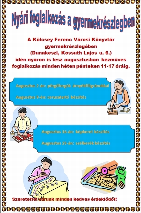 Az idei nyári szünet sem telhet el kézműveskedés nélkül. Most is izgalmas és szép dolgokat készíthetnek a barkácsolni szerető gyerekek és szülők. A foglalkozások minden pénteken 11-17 óráig tartanak.