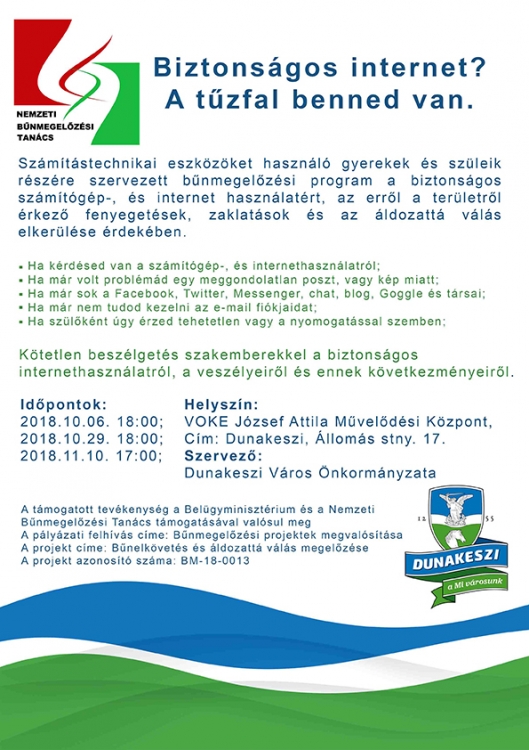 Biztonságos internet? A tűzfal benned van címmel bűnmegelőzési programot szervez Dunakeszi Város Önkormányzata. A részleteket lásd a plakáton.