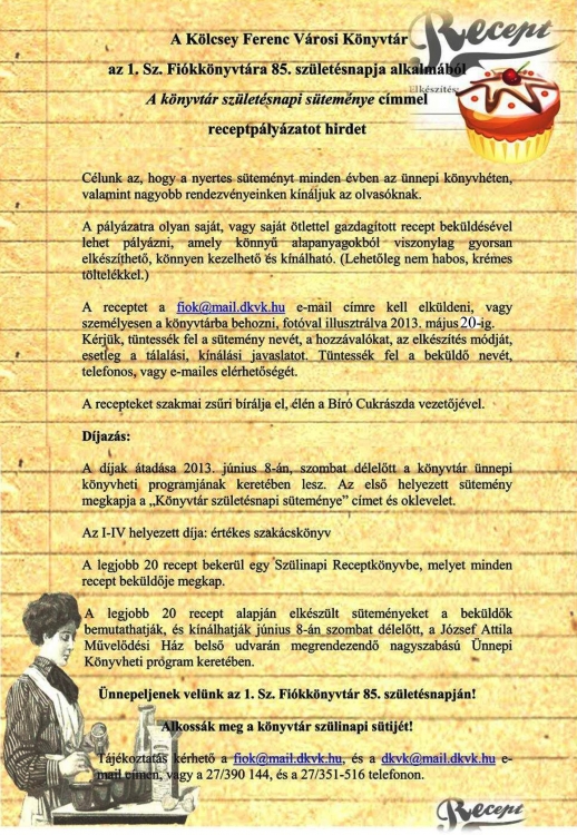 A receptet a fiok@mail.dkvk.hu e-mail címre kell elküldeni, vagy személyesen a könyvtárba behozni, fotóval illusztrálva 2013. május 20-ig. (Folytatás a Részletek-re kattintva!)