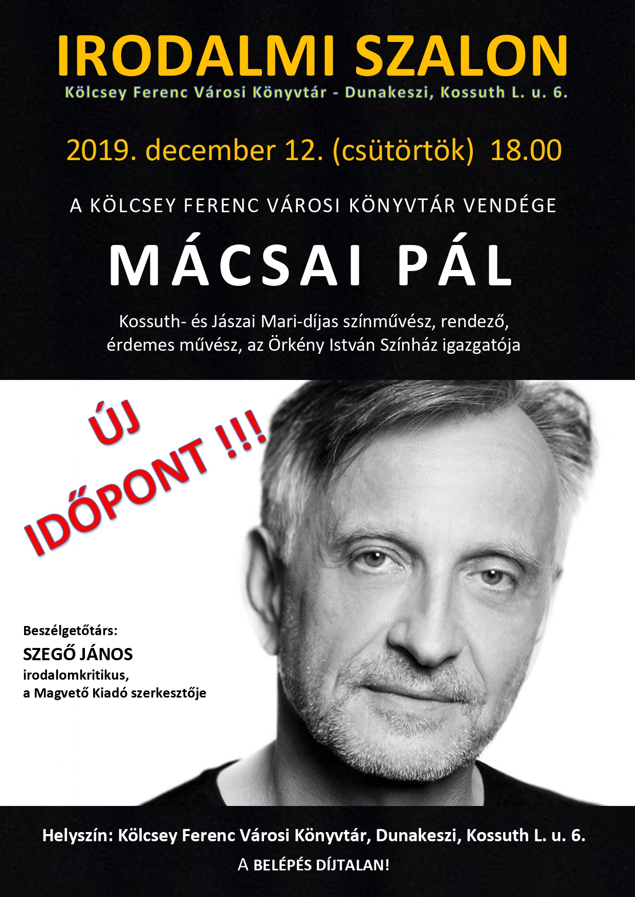 A december 3-án betegség miatt elmaradó Irodalmi Szalonunkat december 12-én (csütörtökön) 18:00 órai kezdettel rendezzük meg.