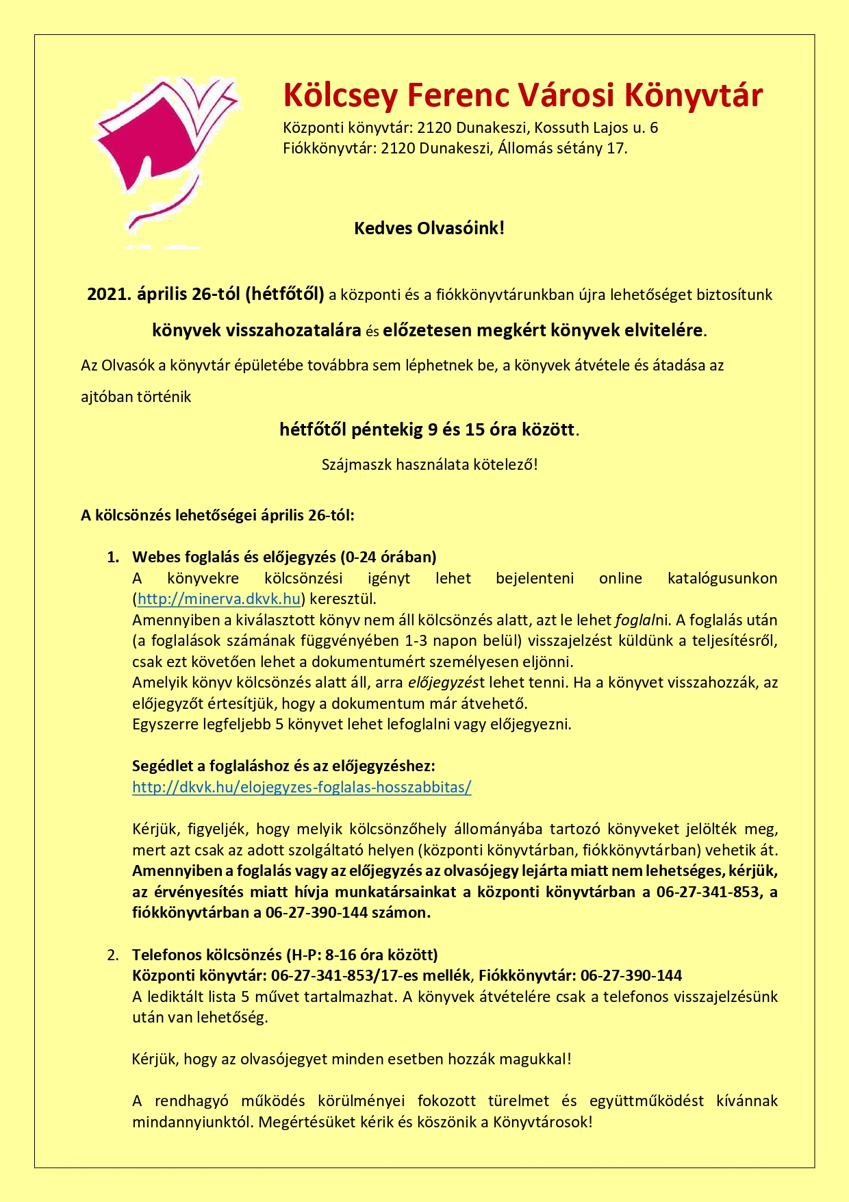 2021. április 26-tól (hétfőtől) a központi és a fiókkönyvtárunkban újra lehetőséget biztosítunk könyvek visszahozatalára és előzetesen megkért könyvek elvitelére.