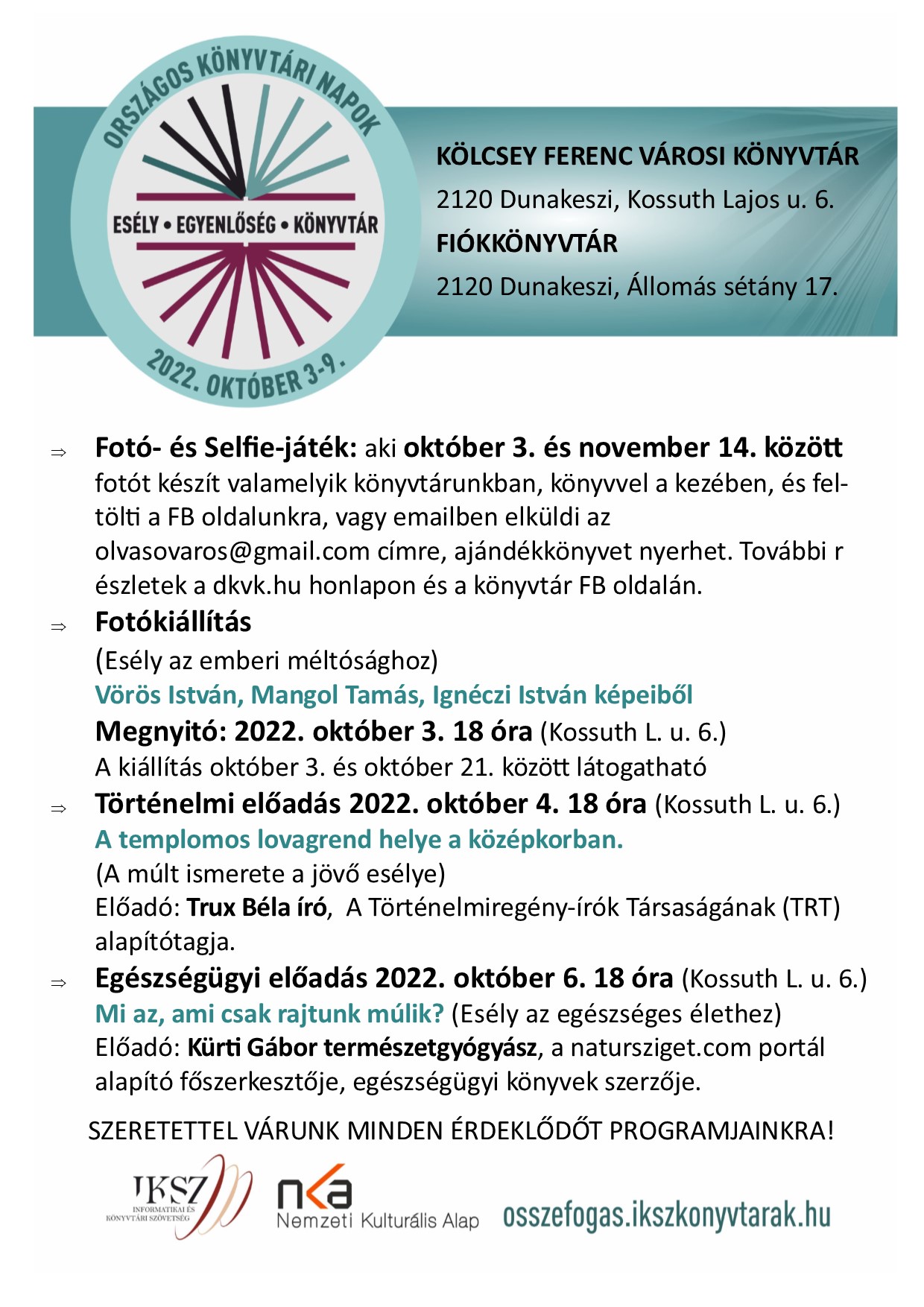 Azok az olvasóink, akik a központi (Kossuth Lajos utca 6.), vagy a fiókkönyvtárban (Állomás sétány 17.) egy fotót készítenek magukról, családtagjukról, vagy ismerősükről, akár kedvenc könyvükkel a kézben (fontos, hogy a könyvtár belső tere, vagy külső portálja felismerhető legyen), és azt 2022. november 14-ig feltöltik a könyvtár Facebook oldalára, vagy névvel együtt elküldik az olvasovaros@gmail.com címre, sorsoláson vesznek részt, amelyen könyveket nyerhetnek. Egy beküldött fotóval egy ajándékkönyv nyerhető!