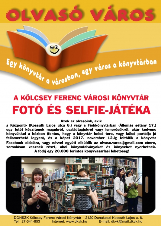 Az Olvasó Város (selfie) játékunk nyerteseinek sorsolása november 29-én történik. A díjátadóra december 9-én szombaton 10.00 órakor kerül sor a központi könyvtár (Kossuth Lajos u. 6.) olvasótermében.