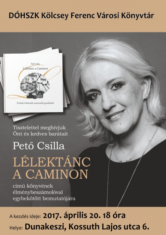 2017. április 20-án, csütörtökön 18 órakor Pető Csilla Lélektánc a Caminon című könyvének élménybeszámolóval egybekötött bemutatója a DÓHSZK Kölcsey Ferenc Városi Könyvtár olvasótermében.