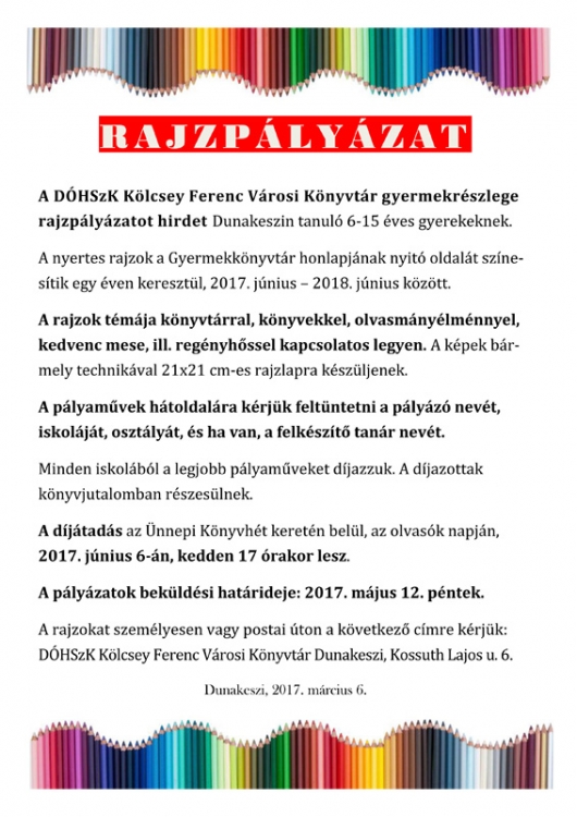 A DÓHSzK Kölcsey Ferenc Városi Könyvtár gyermekrészlege rajzpályázatot hirdet Dunakeszin tanuló 6-15 éves gyerekeknek. A nyertes rajzok a Gyermekkönyvtár honlapjának nyitó oldalát színesítik egy éven keresztül, 2017. június – 2018. június között. A rajzok témája könyvtárral, könyvekkel, olvasmány élménnyel, kedvenc mese, ill. regényhőssel kapcsolatos legyen. A képek bármely technikával 21×21 cm-es rajzlapra készüljenek. A pályaművek hátoldalára kérjük feltüntetni a pályázó nevét, iskoláját, osztályát, és ha van a felkészítő tanár nevét. Minden iskolából a legjobb pályaműveket díjazzunk. A díjazottak könyvjutalomban részesülnek. A díjátadás az Ünnepi Könyvhét keretén belül, az olvasók napján, 2017. június 06-án, kedden 17 órakor lesz. A rajzok beküldési határideje: 2017. május 12. péntek. A rajzokat személyesen vagy postai úton a következő címre kérjük: DÓHSzK Kölcsey Ferenc Városi Könyvtár Dunakeszi, Kossuth L. u. 6.