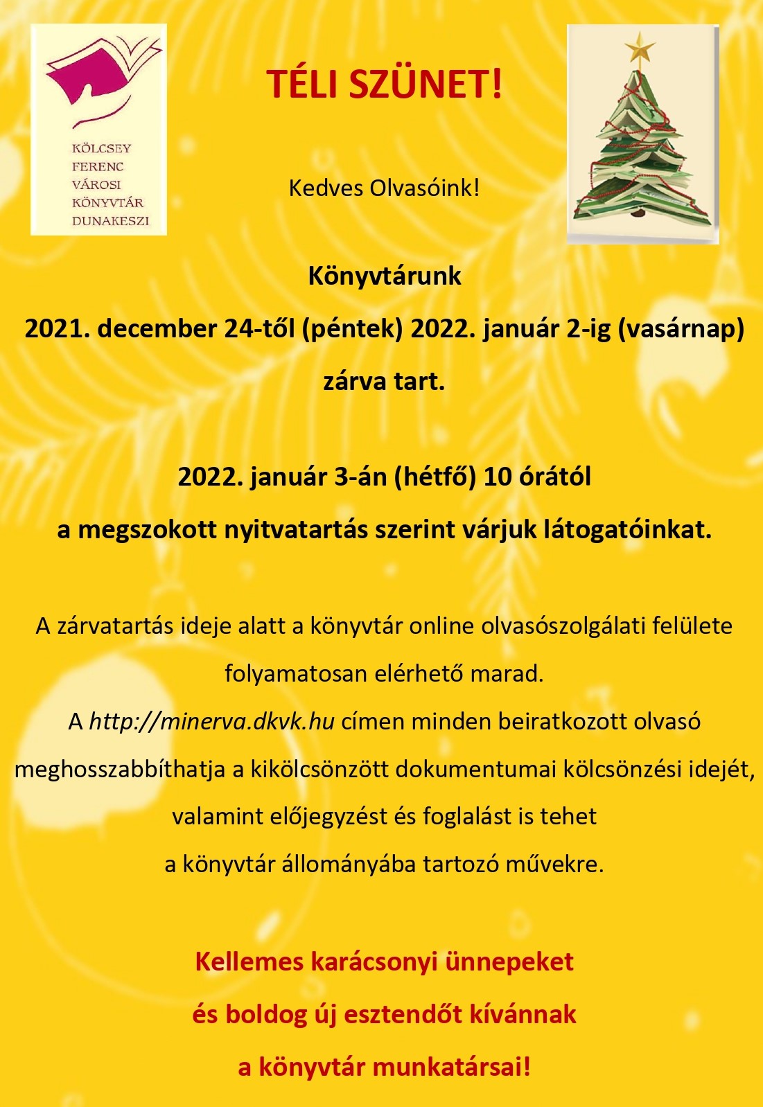 Központi és fiókkönyvtárunk 2021. december 24-től (péntek) 2022. január 2-ig (vasárnap) zárva tart.
