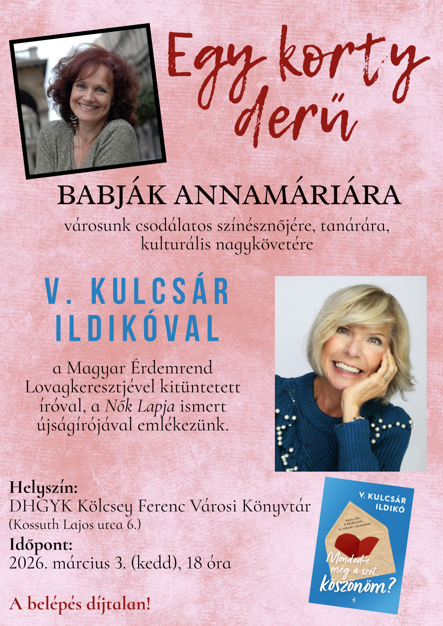 Egy korty derű című rendezvényünkön Babják Annamáriára emlékezünk V. Kulcsár Ildikóval, a Nők Lapja újságírójával, a Magyar Lovagrend Érdemkeresztjével kitüntetett íróval, aki barátságukról, közös fellépéseikről mesél, és persze írásain keresztül is közel hozza hozzánk városunk közlemúltban elveszített kiváló művészét.